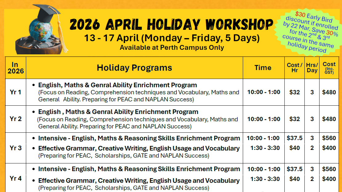 From NAPLAN Preparation for Success Programs to Scholarship / Selective School / GATE / NAPLAN Success Programs and Intensive English, Maths & G.A. Enrichment Program and more! There’s bound to be something to suit your child’s interests. Contact our WA Campuses here and enrol today!